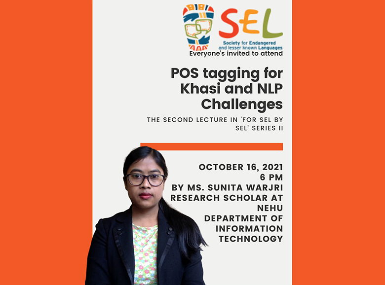 The Society hosted four lectures of members in the second series of For SEL, By SEL where in the first lecture, Dr Bipasha Patgiri talked about markedness and naturalness in Phonology. The second lecture was delivered by our new member, Sunita Warjri. In her presentation ‘POS Tagging in Khasi and NLP Challenges’, she discussed various problems related to POS tagging.